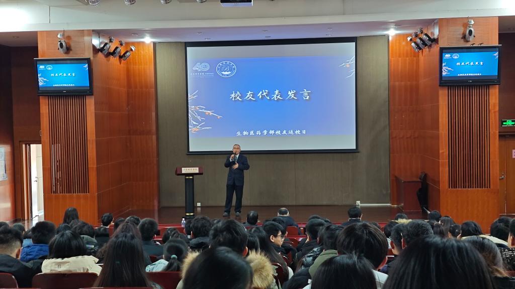 生物医药学部党支部书记杨春梅与学部主任王辉分别上台致辞,表达了对所有到场校友在冬至这个一切向好、充满希望的团聚日子里返校的热烈欢迎。王辉主任从学部历史、师资团队、成果展示等方面向校友们做了介绍,并表示,校友会作为毕业生与母校、学校与社会沟通的桥梁,发挥着十分重要的作用。生物医药学部始终坚持以“守护健康 尽责于微”为精神,为企业培养留得住、干得好的具有较高职业素养和高尚道德情操的专业人才。为了更好地传承学部精神,凝聚校友力量,推动学部发展,生物医药学部将随时为校友搭建毕业生招聘信息推广、校企联络与服务社会的平台,为广大校友们提供更多更好的交流与合作机会。