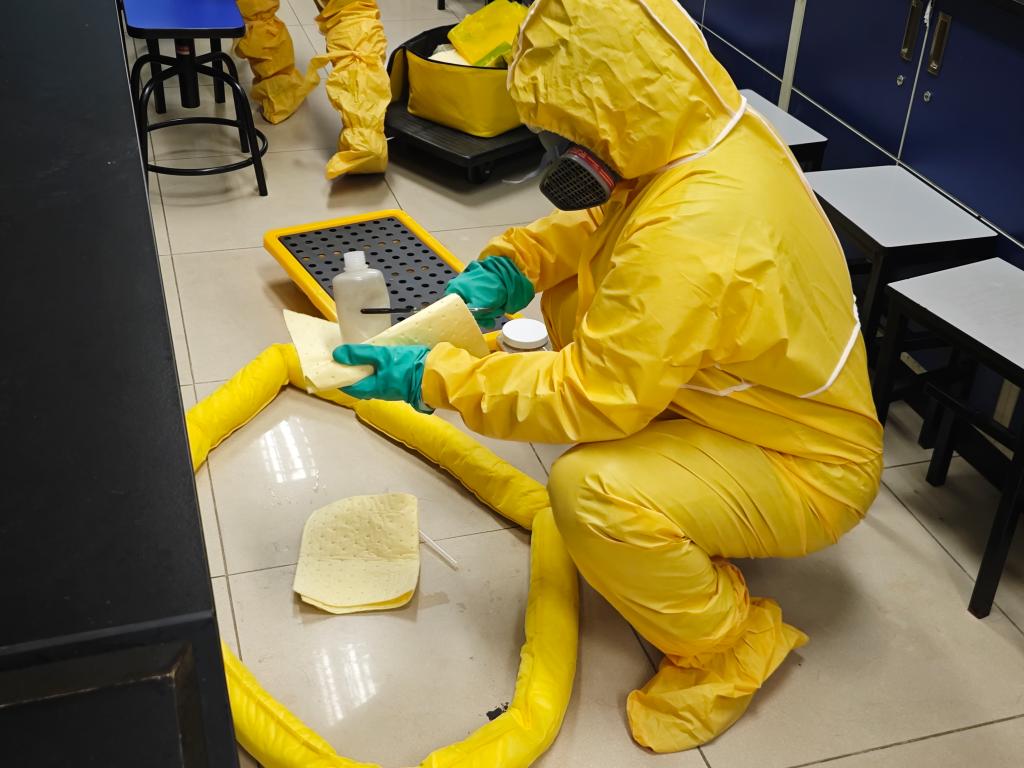 随后进行的演习活动设置了六个不同的场景,涵盖了实验室可能遇到的各类突发情况。在“实验室玻璃器材割伤”场景中,参演人员迅速对受伤人员进行伤口处理和包扎;在“实验室少量化学品灼伤”场景中,及时用大量清水冲洗受伤部位,并进行后续的医疗处理;针对“少量的危险化学品液体泄漏”和“大量的危险化学品废液泄漏”场景,参演人员按照应急预案,迅速采取措施,防止化学品扩散和环境污染;在“实验台面酒精灯倾倒着火”和“实验室电加热设备着火”场景中,参演人员熟练疏散人群,使用灭火器和灭火毯等设施,成功控制了火情。