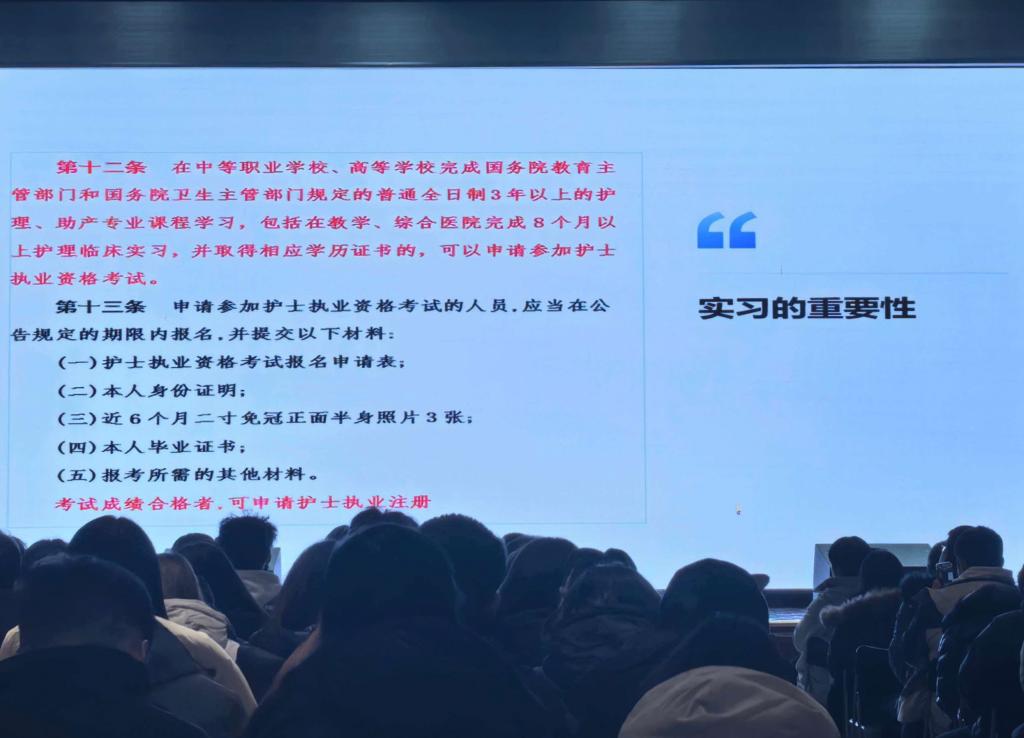 刘主任的分享围绕同学们的核心需求展开,内容详实、案例鲜活,涵盖实习、备考、就业三大核心板块,每一项都是关乎未来的关键要点。护资考试作为护理行业的入门凭证,是同学们必须攻克的关键关卡。刘主任建议同学们结合自身情况,选择适合自己的备考方式,积累知识,为考试做好充分准备。