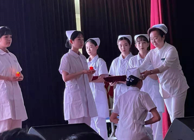 文化节中,护理前辈为学生授帽,用蜡烛传递“燃烧自己,点亮他人”的护理职业道德;小品比赛中,学生通过情景剧展示党的历史的波澜壮阔,并致敬抗疫一线护理前辈、表达勇担使命的决心;指导老师为20届毕业生代表拨穗,也为即将踏上实习岗位的同学树立前行的榜样。