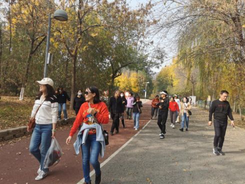 活动于下午一点半在奥森北园西门正式开始,大家兴致高昂,热情洋溢,沿公园健身步道一同向南出发,途径银杏林、花海等景观点时,老师们纷纷驻足欣赏,打卡合影,共同感受多彩的深秋美景,在轻松的氛围中尽情享受运动的乐趣。