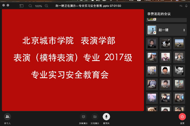 各专业在“云动员会”上向2017级本科生宣讲贯彻了学校关于“深造培育”替代专业岗位实习的最新政策,激起了考研学生的极大兴趣。2020年的专业岗位实习,表演学部各专业都是第一次在学校优慕课平台设置《校外实习实践》课程,学生的实习记录、各类实习材料都将在《校外实习实践》课程中提交,实现学生校外实习实践线上线下的协同管理。“云动员会”上的重中之重仍然是学生们在专业岗位实习和“深造培育”过程中的安全问题,老师们在会上一再叮嘱同学们,除了要注意以往的常规安全问题,大家更要重视疫情带来的严峻挑战。