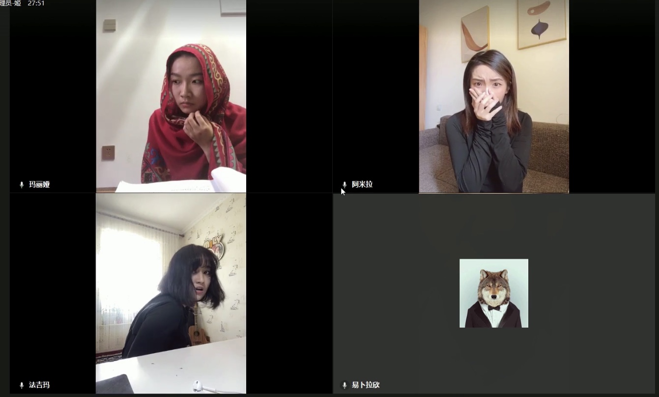 2020年6月23—24日,表演学部18影表本3班学生,在表演(影视表演)教研室于点老师和张默老师的带领下,利用企业微信平台搭建虚拟剧场空间,以“云”演出的方式,完成了五个剧目的展演。包括独幕剧作品《女士们的游戏》、多幕剧改编作品《哈姆雷特》、《五种沉默》、《伪君子》和《青蛇》。