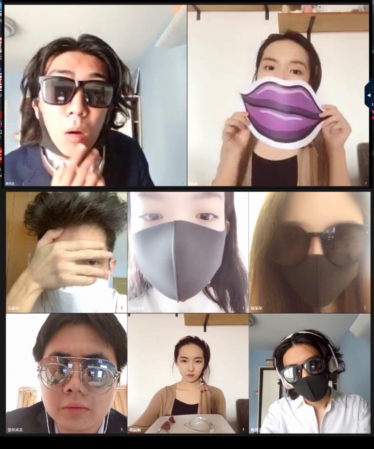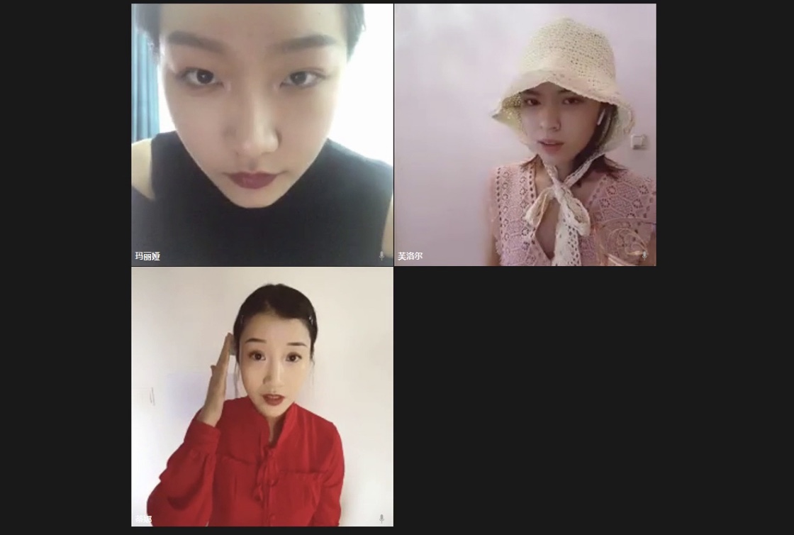 不同于录播形式的戏剧演出和常规的线上剧本朗读,此次的云上直播演出,需要学生运用各自的电子设备镜头,以“宫格”式样的图视效果集体呈现在屏幕上。每一位学生既是角色的扮演者又是所扮演角色的摄像师、化妆师、灯光师、音效师等。经过创造性编排这些“宫格”中的影像和声音,努力打破环境的隔阂,开启穿越空间和屏幕局限的“现场性戏剧表演”。