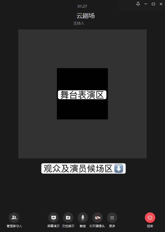 云剧场观众通过微信扫码进入观众群,在群组中以接龙的方式预约想要观看的演出场次。虚拟剧场保留完整的剧场仪式,提前入场、入场须知、播放场钟、谢幕及闭幕。