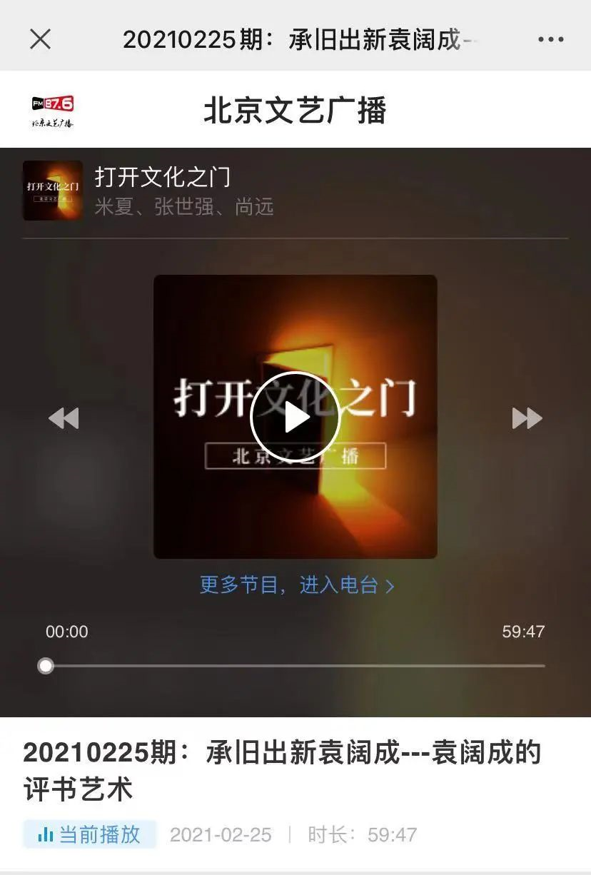 2021年2月25日上午10:00,sunbet申搏官方网站表演学部曲艺教研室副主任张伟老师,与北京集贤弘艺文化中心曲艺理论家谢岩老师,共同做客北京文艺广播电台(FM87.6),进行现场直播录制“承旧出新袁阔成——袁阔成的评书艺术”专题,《打开文化之门》栏目。