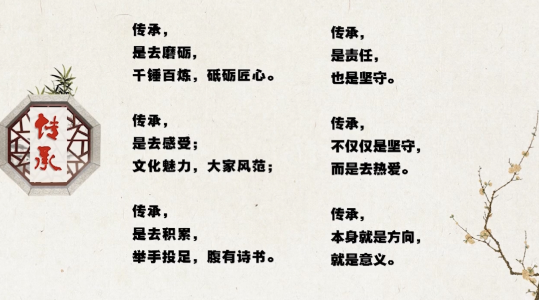拍摄之初,孔星徽同学及其团队大量查阅相关资料,深思熟虑后决定以“传承”为主题拍摄短片,他认为传承在学校中无处不在,不仅教师在课堂中的教授是传承,课下延伸出的“传艺与传德”更是一种传承,它不同于简单的说教,而是以“师爱为魂,学高为师,身正为范”的方式潜移默化地影响学生。正是因为对视角与题材的恰当选取,该作品在本次展映活动中获得了不错的成绩。
