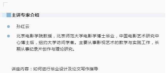 孙红云教授以选题出发,从选题的前期调研、进行创作或研究现状综述、如何确定有兴趣有价值的选题这三个方面展开讲解;又从创作或设计过程的跟踪到设计的结构,来阐述如何帮助学生走出迷茫期,如何启发学生从中找到解决问题的方法,反思在创作中运用的理论依据;并对致谢、参考文献、附录等论文结构提出了指导要求。