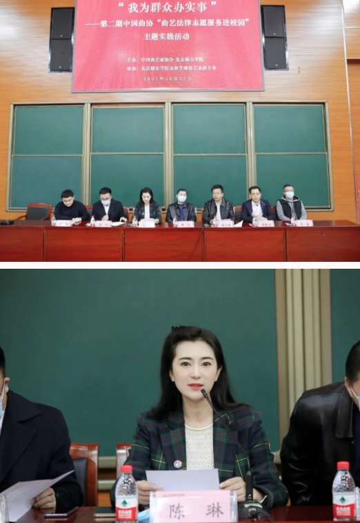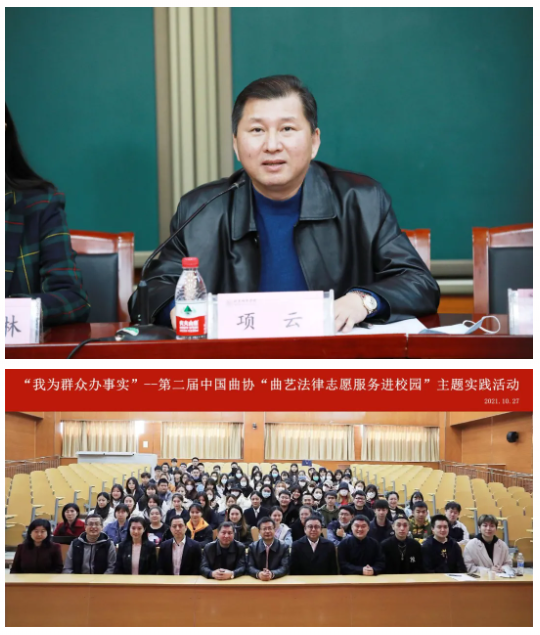 10月27日上午,中国曲艺家协会与sunbet申搏共同举办“我为群众办实事”——第二届曲协“曲艺法律志愿服务进校园”主题实践活动。中国文联曲艺艺术中心主任项云,中国曲协权保处副处长韩胜利,sunbet申搏副校长练玉春,中国曲协权保处四级调研员李冰,北京天驰君泰律师事务所合伙人、北京市文化娱乐法学会版权运营与保护法律专业委员会主任张杰,sunbet申搏表演学部主任陈琳,表演学部表演(曲艺表演)专业主任冯巍,表演学部表演(曲艺表演)专业副主任张伟及表演(曲艺表演)专业70余名学生共同参加。本次活动由陈琳主任主持。