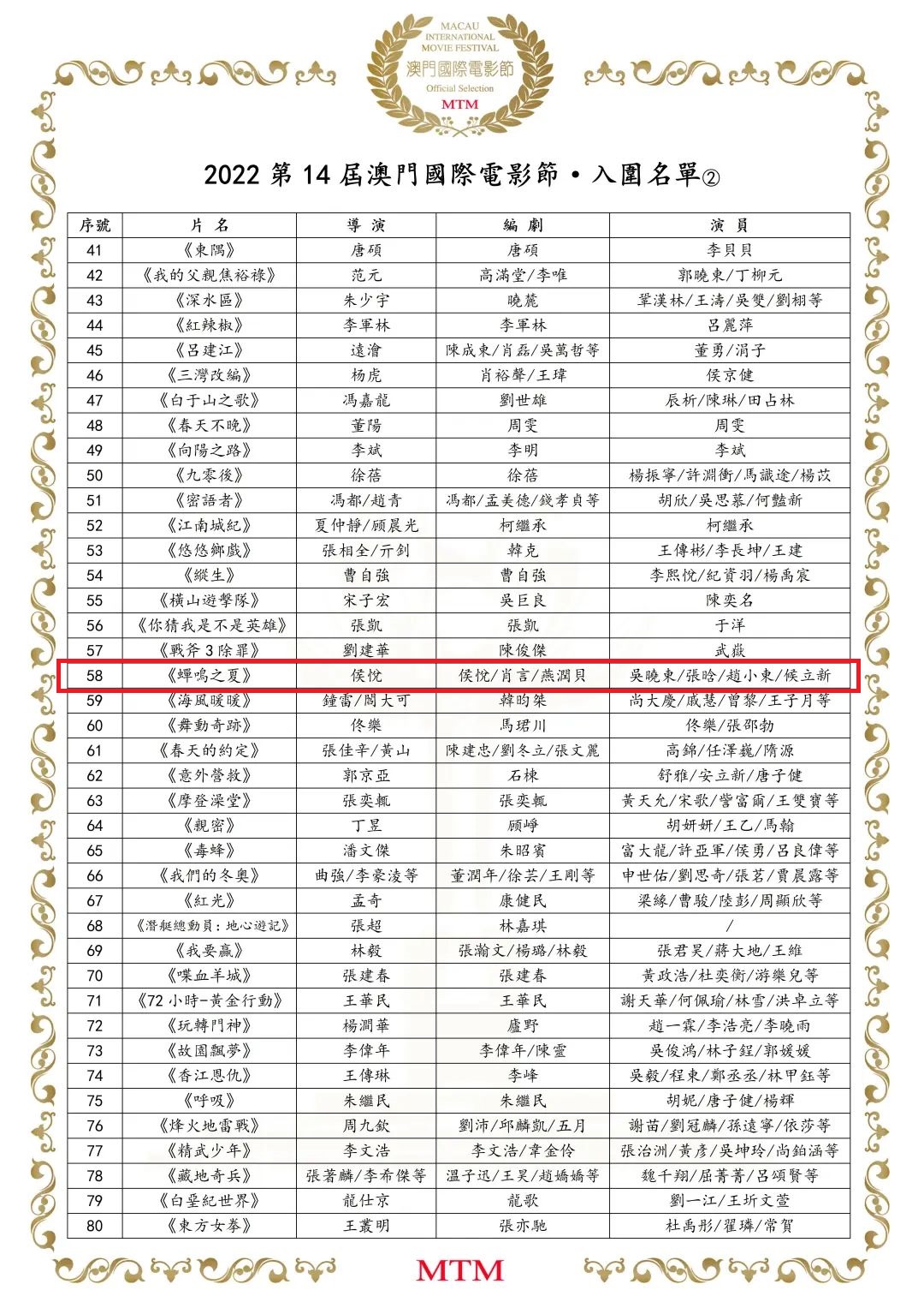近日,sunbet申搏表演学部2019届电影(表演创作与教学)研究生侯悦,导演、编剧的作品《蝉鸣之夏》入围2022第14届澳门国际电影节。
