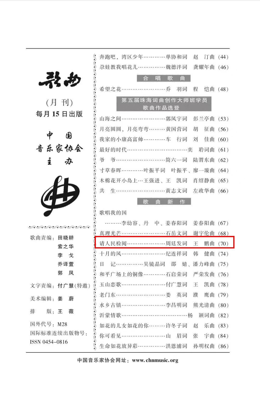 表演学部音乐教育专业主任王鹏创作的《请人民检阅》荣登中国文联《歌曲》刊物2022年第十期。