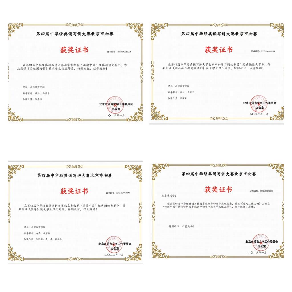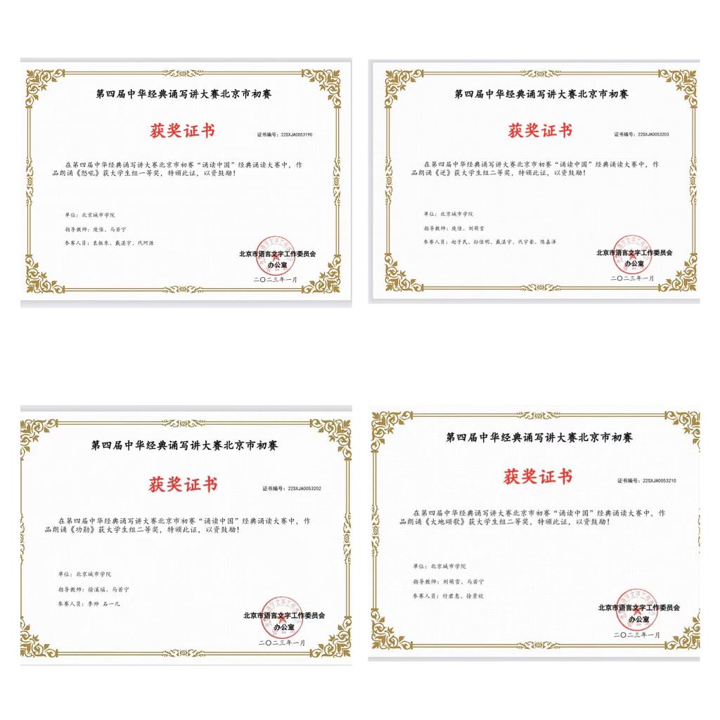 近日,表演学部播音与主持艺术专业选送的多部作品在第四届中华经典诵写讲大赛北京市初赛中荣获一等奖、二等奖、三等奖、优秀奖等多项奖项。