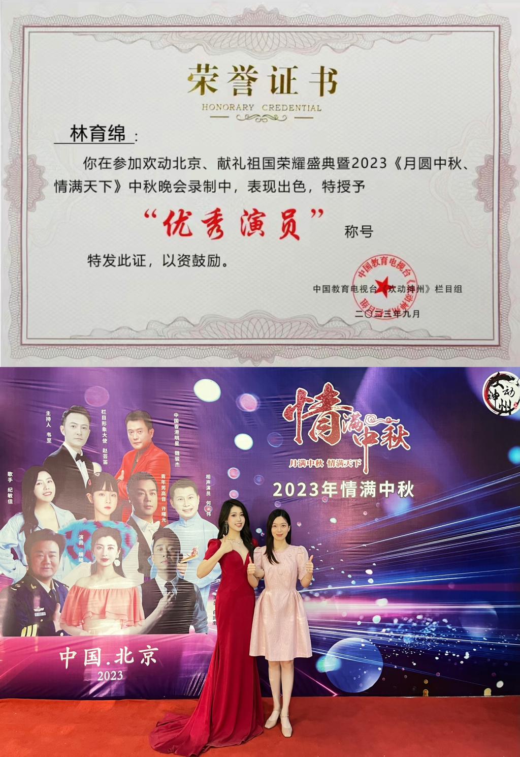 近日,表演学部2021级音乐教育专业学生林育绵在京参加中国教育电视台《欢动神州》中秋特别节目录制,演唱了歌颂万家团圆相约好时节的《中华好明月》,以饱含深情的歌声献礼祖国,弘扬中华优秀传统文化的魅力,展现新时代大学生昂扬奋进的精神风貌。