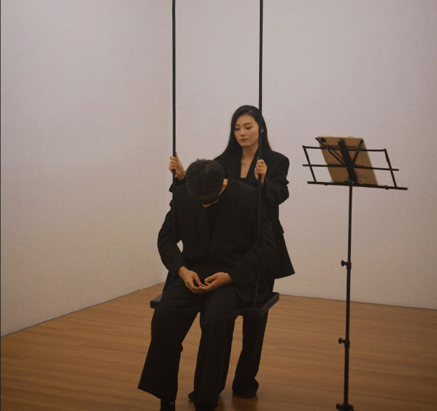 《为秋千的小品》(文子洋作曲)是2021级表演(影视表演)专业的同学与一位中提琴演奏家而作的装置艺术项目,这部作品强调“每次为一位听众演奏的现场表演与整体环境装置体验乐器”,在作品的表演过程中,演员对观众的牵引,以及与中提琴演奏家的肢体互动,赋予了每位秋千上的听众空间性的声音感知,于现场的观众而言,演员的表现力也增强了作品的声音从出现到消散的具象动态。