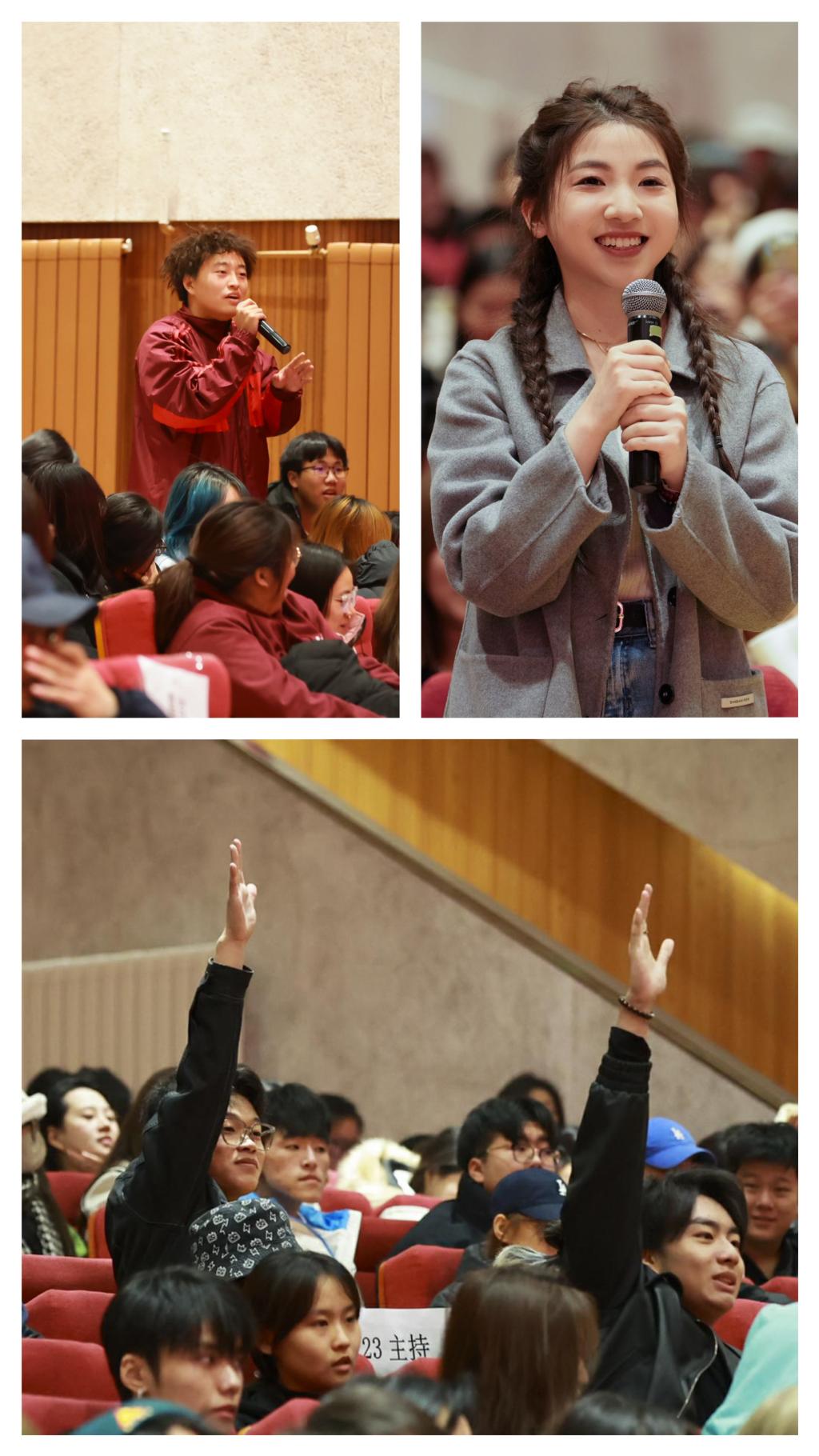 在提问环节中,各位艺术导师回答学生问题并鼓励学生,保持对生活的热爱,踏实认真学好基础课,保持自律、自知、自喜、自爱,把自己修炼好,为自己的梦想奋斗。
