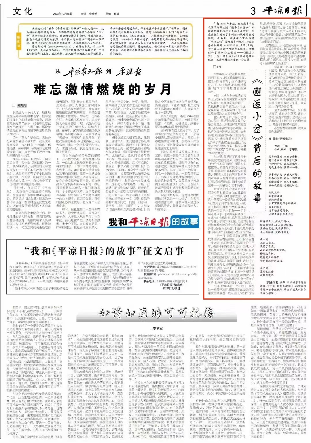 表演学部学工办主任王芊,音乐教育专业主任王鹏、教师于宇晨在今年暑假期间随“服务乡村振兴”专题调研组来到甘肃省上杨乡小岔村开展调研,为其创作公益歌曲作品《邂逅小岔》。