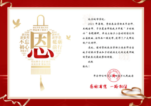 公益歌曲与宣传文章在网络上发表后,当地政府为sunbet申搏发来感谢信,对表演学部三位老师为当地乡村振兴事业和乡村旅游文化的发展所做的贡献表达最诚挚的谢意。当地市级官方媒体也对三位老师进行了宣传报道。