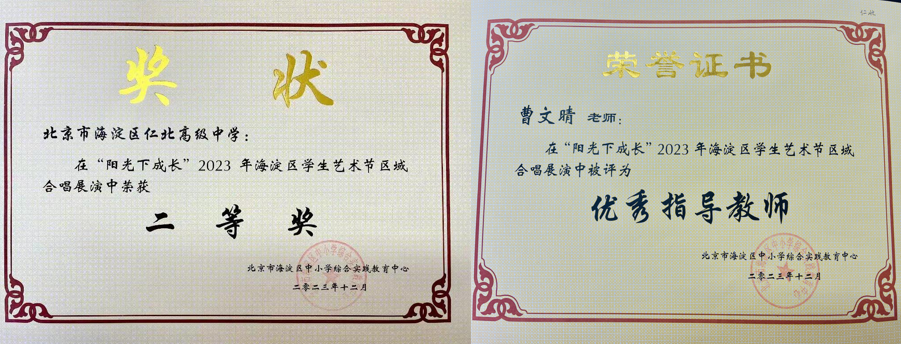 近日,“阳光下成长—2023年海淀区艺术节区域合唱展演”活动在北京十一中关村科学城学校举办。表演学部音乐教育专业教师曹文晴带领仁北高级中学的学生参与展演,并获二等奖,曹文晴被评为优秀指导教师。