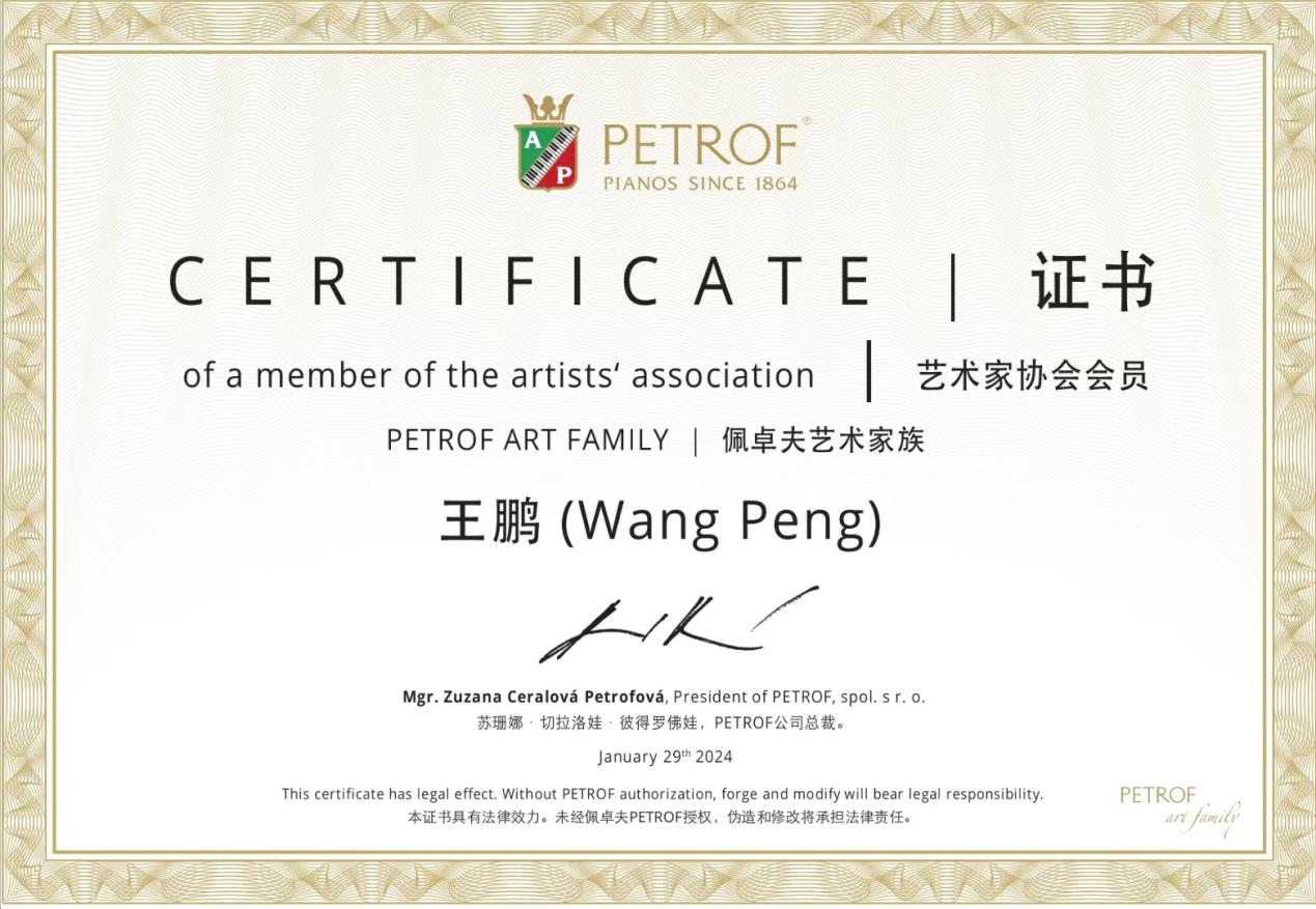 表演学部音乐教育专业主任王鹏副教授,于2024年新年伊始受聘成为捷克国宝钢琴(PETROF)佩卓夫艺术家。