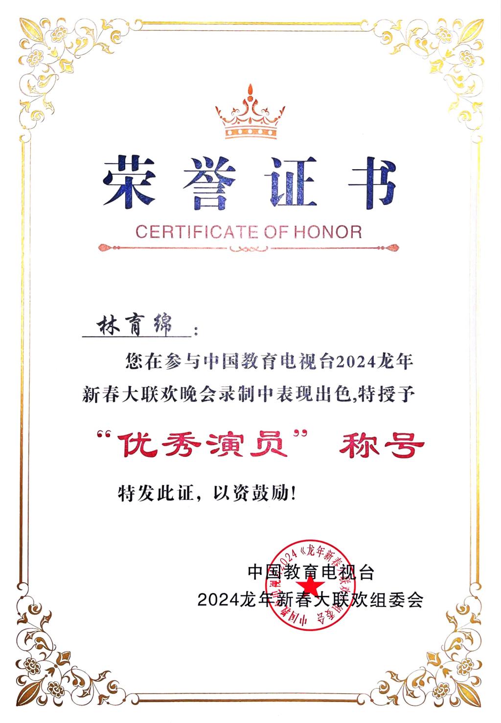《欢乐中国年》是由中国教育电视台CETV1面向全国播出的一档春节特别节目。林育绵同学在此次演出活动中,以饱满的激情、悠扬动听的歌声和积极昂扬的状态录制节目,抒发了人与自然和谐共生,守护绿水青山,共绘美丽中国的美好愿景。