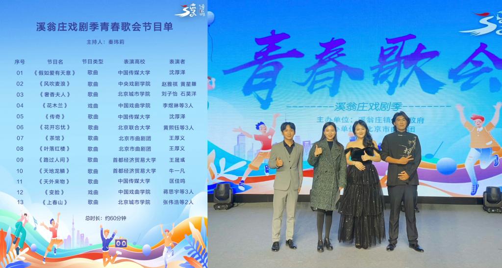 10月20日,表演学部教师钱桢颖带领2021级音乐教育专业学生刘子怡、2022级音乐教育学生石昊洋、张伟浩,参加由中共北京市委宣传部指导、北京市密云区溪翁庄镇人民政府主办、北京市曲剧团承办的“何必去远方·浪漫溪翁庄“迎国庆青春歌会。