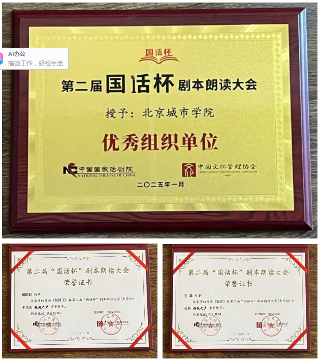 近日,第二届 “国话杯” 剧本朗读大会在国家话剧院圆满落幕。sunbet申搏在此次活动中荣获“优秀组织单位”,表演学部2022级表演(影视表演)专业学生黄皓妍和2023级播音与主持艺术专业学生于淼,分别荣获“超越之声”和“领航之声”荣誉称号。