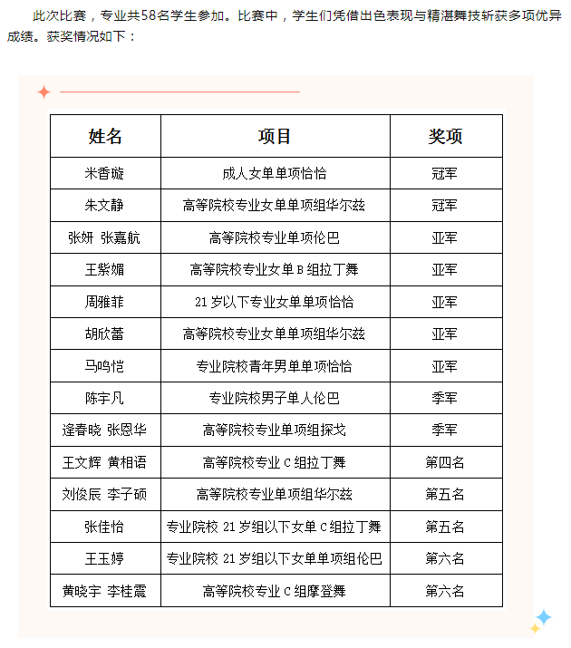 本次学院杯的优秀成绩展现了表演学部舞蹈表演(国际标准舞)专业在“学创结合、以演促编、以赛促练,强化实践”的培养理念下,以“舞”育人的显著成效。未来,专业将继续为学生搭建实践交流平台,提高学生专项技能,培养符合新时代要求的体育舞蹈高素质应用型人才。
