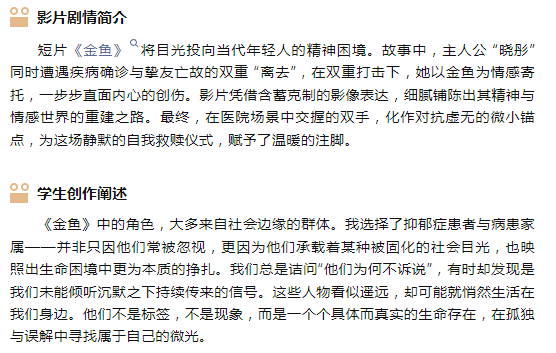在表演学部业务板块支持下,由广播电视编导(影视编创)专业2022级学生徐子昀导演、专业主任刘铭嘉作为摄影指导的短片《金鱼》入围多伦多国际诺莱坞电影节 (TINFF) 、加拿大电影电视学院 (CANADIAN SCINEMA & TELEVISION) 资格电影节、ARDEA电影节以及西普拉电影节(CFF)。