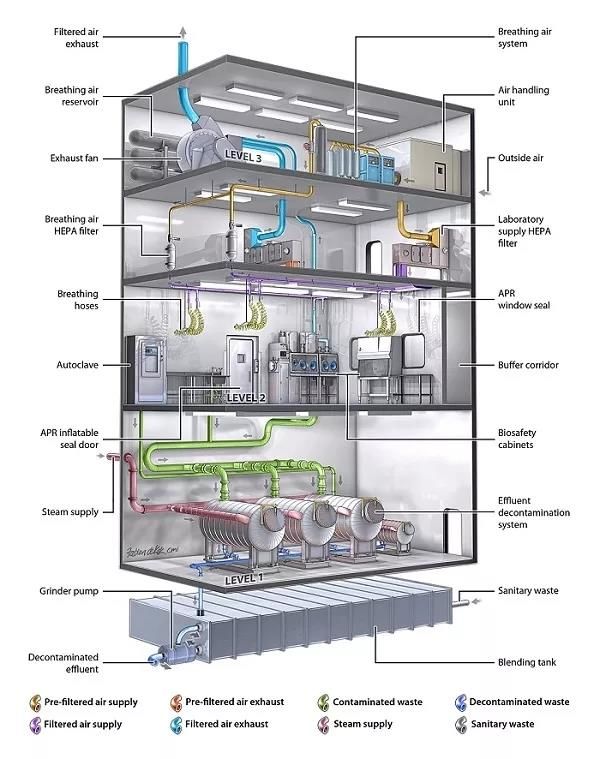 虽然实验室只有一层,配套的动力设备却有好几层。连实验室内的废气都要经过两级高效过滤器处理后才可以排放,感染性材料和被污染的器具等固体污染物要也要经过严格的灭菌处理,打包装袋后由专业医疗废弃物公司做无害化焚烧处理。废弃液体则要经密闭管道收集后经高温灭菌处理后无害化排放,以保证彻底杀灭病原,确保实验室里的病原无处可逃。