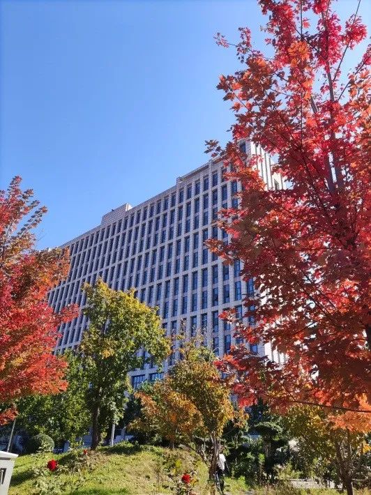 红色的秋天-- -赵学良--秋色的中午时光,北城校园里娇艳的月季红、挺拔的枫叶红和整洁的宿舍楼砖红,在同一片蓝天下展示各自的美。