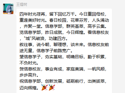 初春四月,花香满园,4月15日,信息学部积极配合学校校友返校日工作,开展了丰富多彩的校友返校活动。
