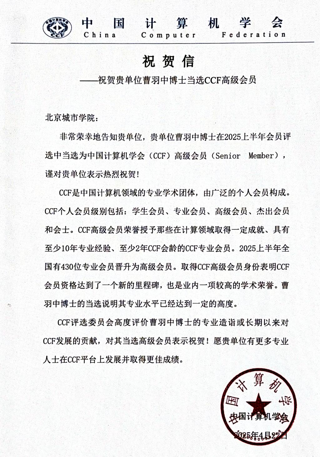 近日,中国计算机学会(CCF)发来贺信,信息学部软信教研室主任曹羽中在2025年度CCF会员级别评审中当选为CCF高级会员(Senior Member)。CCF评审委员会高度评价了曹羽中老师的专业造诣和长期以来对CCF发展的贡献,同时欢迎sunbet申搏有更多专业人士在CCF平台上发展并取得更佳成绩。