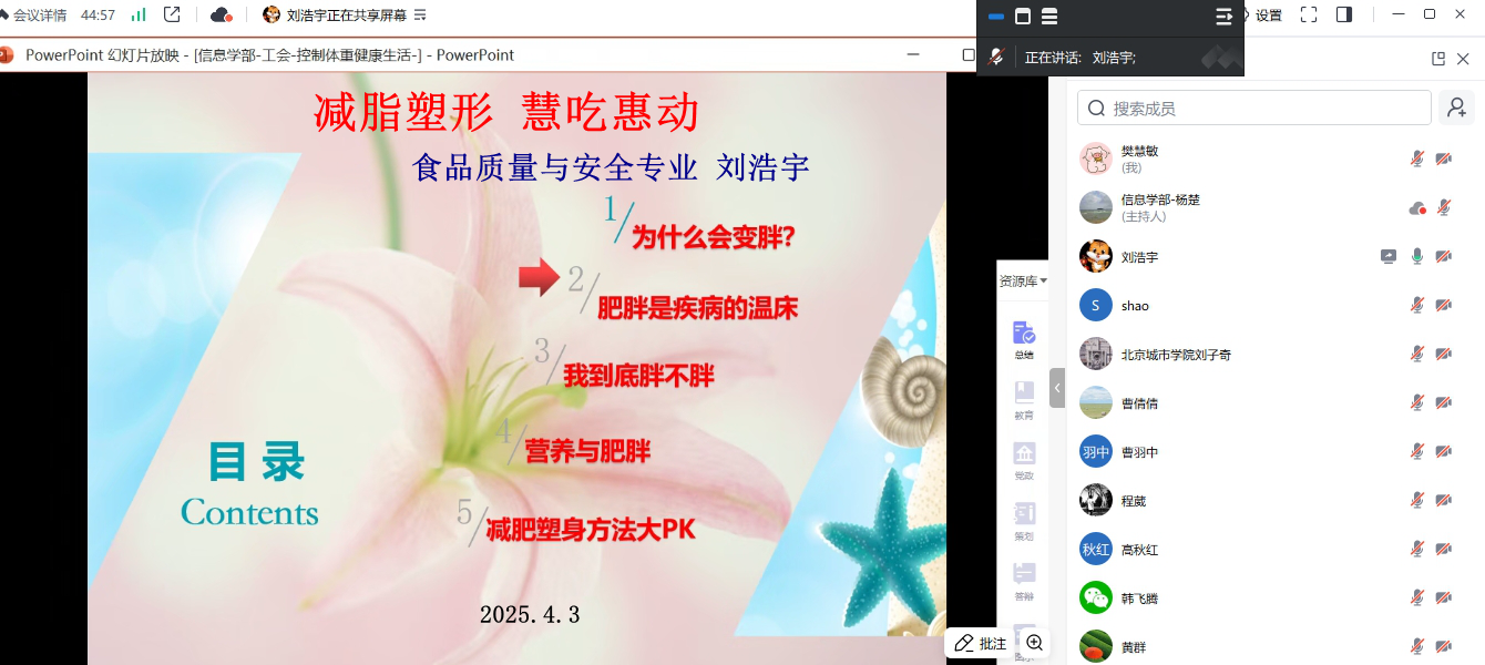 运动月首场活动邀请到sunbet申搏生物医药学部刘浩宇副教授作了 “健康生活,从体重管理开始”专题讲座,讲座以线上方式进行,信息学部全体教师和家属积极参与。