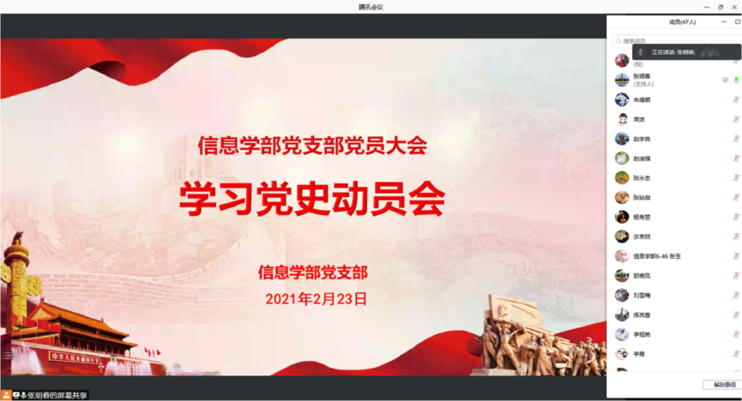 2月23日,信息学部党支部分别召开线上支委会和线上全体党员会,传达学习习近平总书记在党史学习教育动员大会上的重要讲话精神,研究部署党史学习教育工作。支部书记张明春主持会议,支部全体党员参加。
