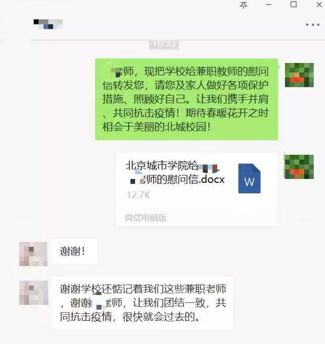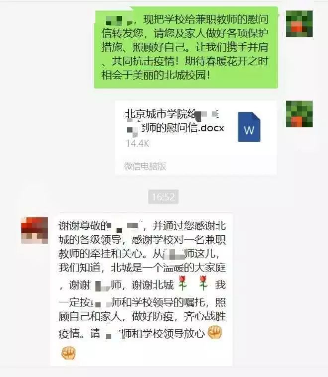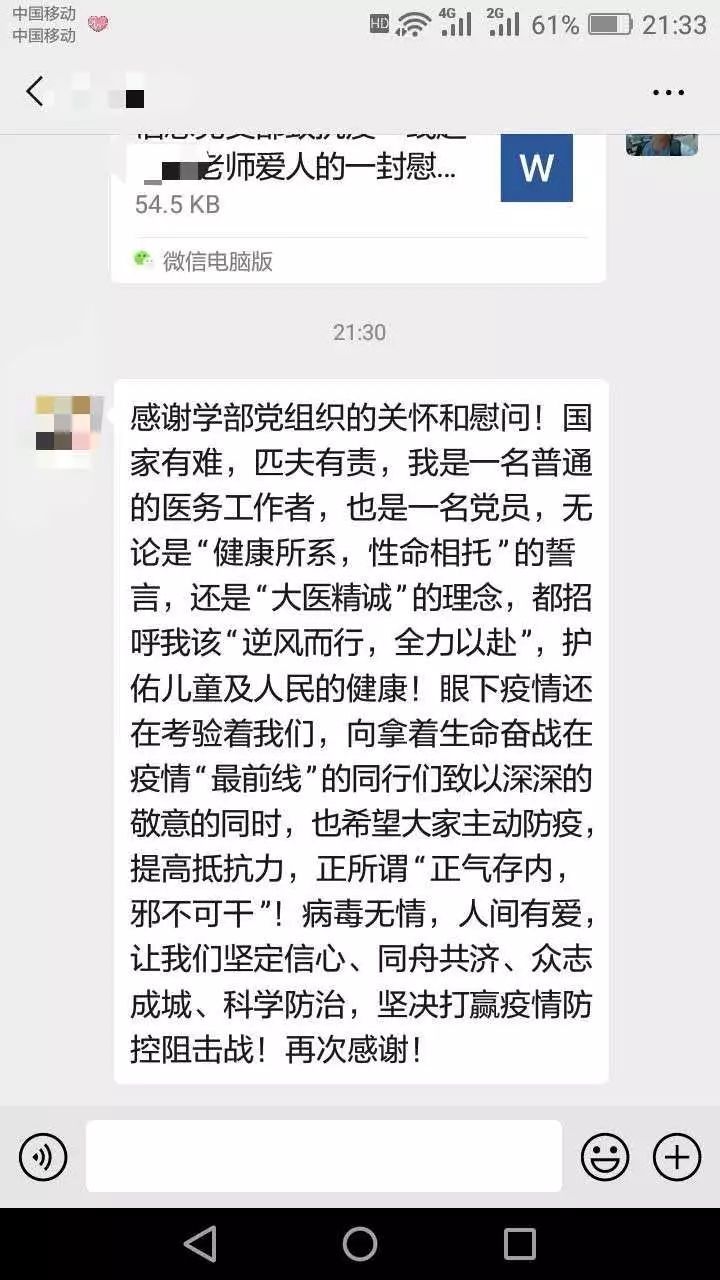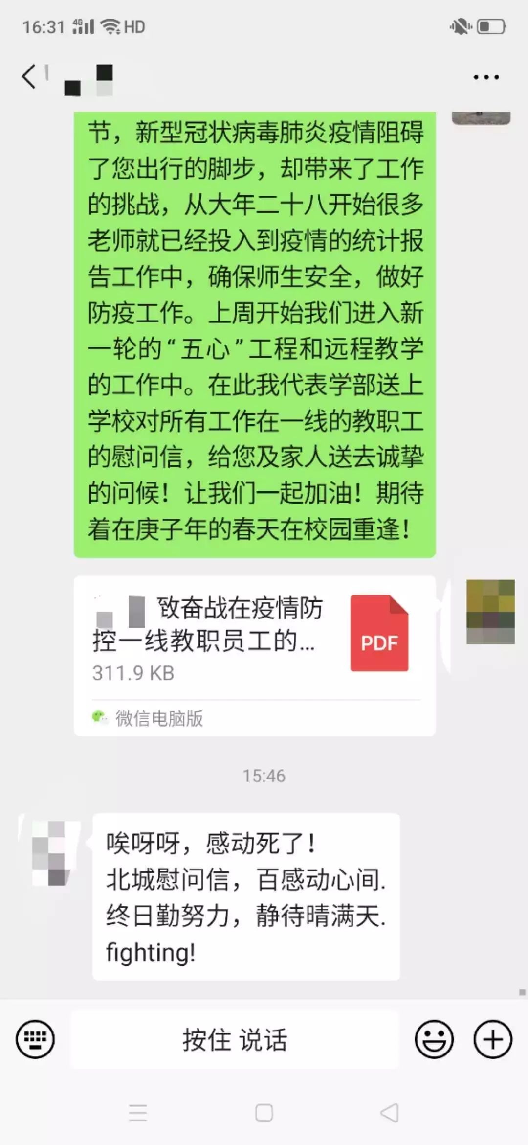奋斗在教学一线的兼职教师,像我们的家人一样并肩作战,是学部发展不可或缺的力量。他们的平安健康牵动着全体师生的心。疫情发生后,支部第一时间委托专业沟通对兼职教师转达支部慰问信。