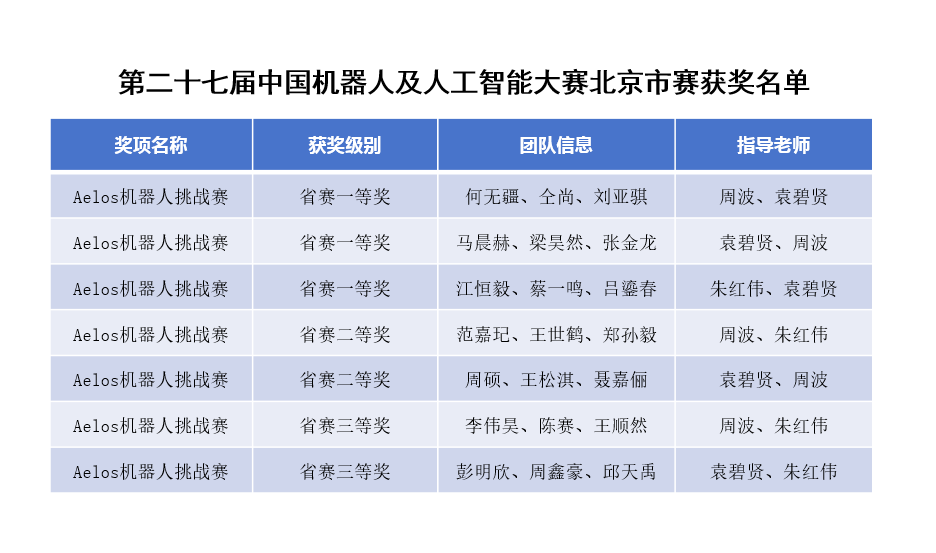 近日,第二十七届中国机器人及人工智能大赛北京市赛成绩公布,信息学部物联网工程、人工智能、软件工程三个专业学生组成的参赛团队表现优秀,在Aelos机器人挑战赛项目中荣获一等奖3项、二等奖2项及三等奖2项,四支队伍晋级国赛。